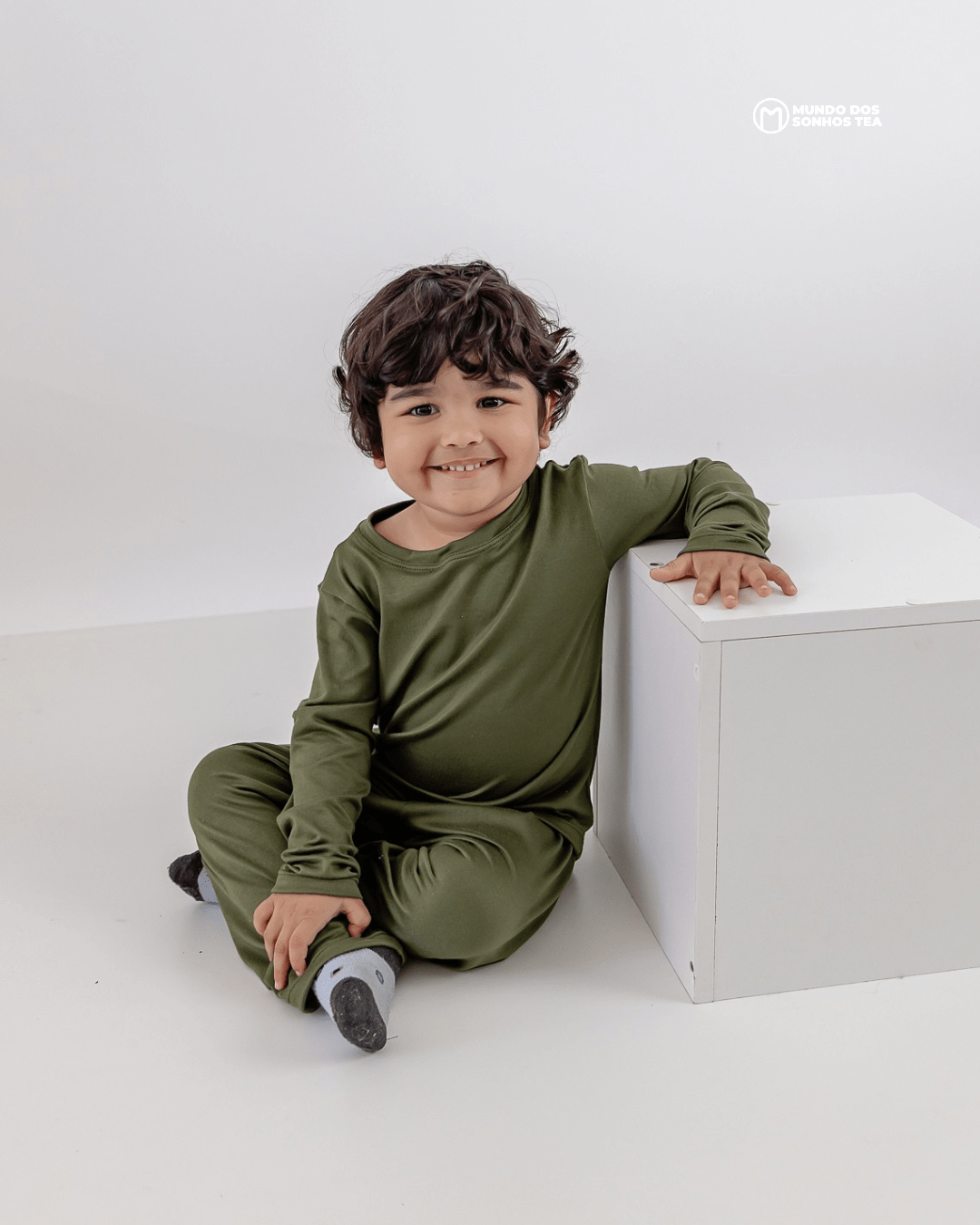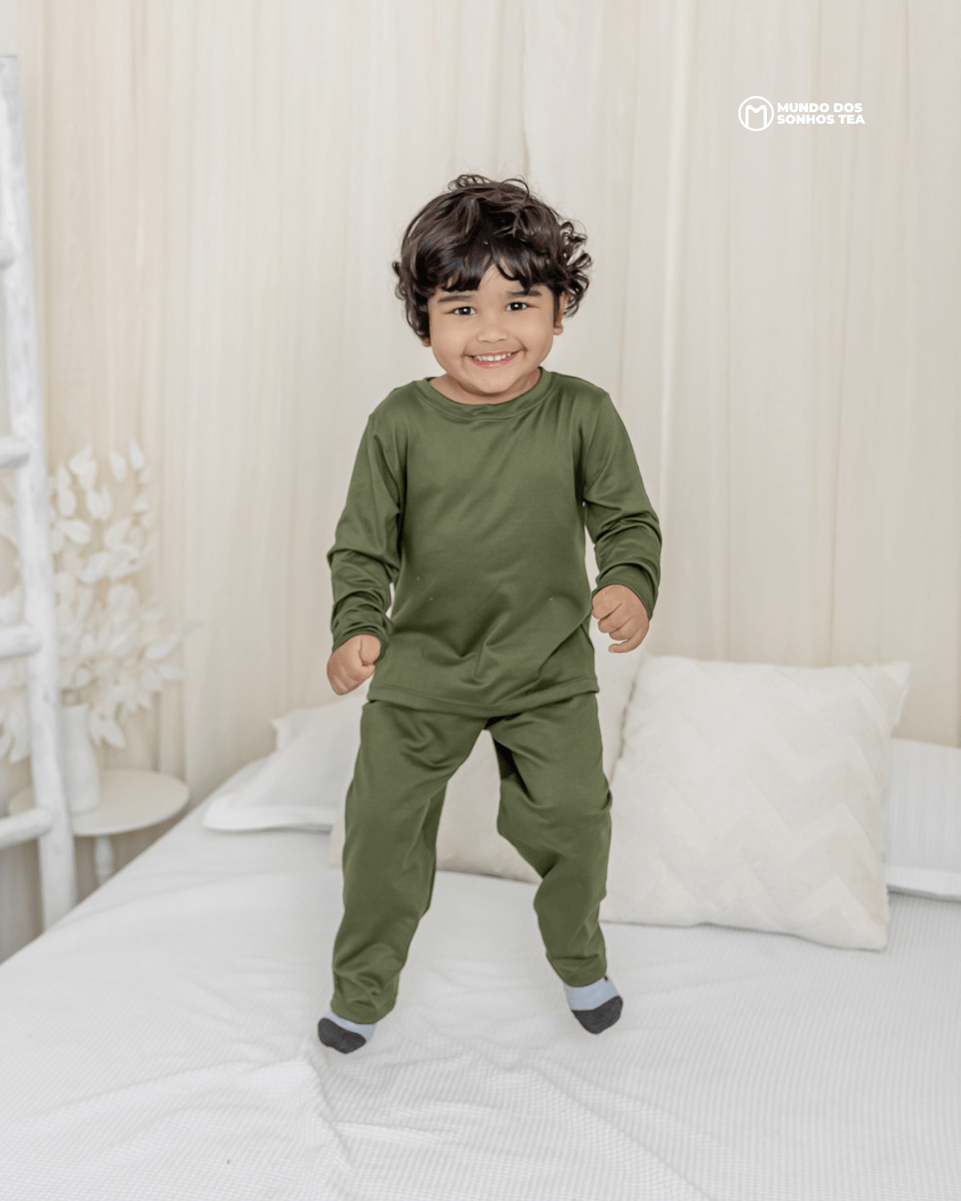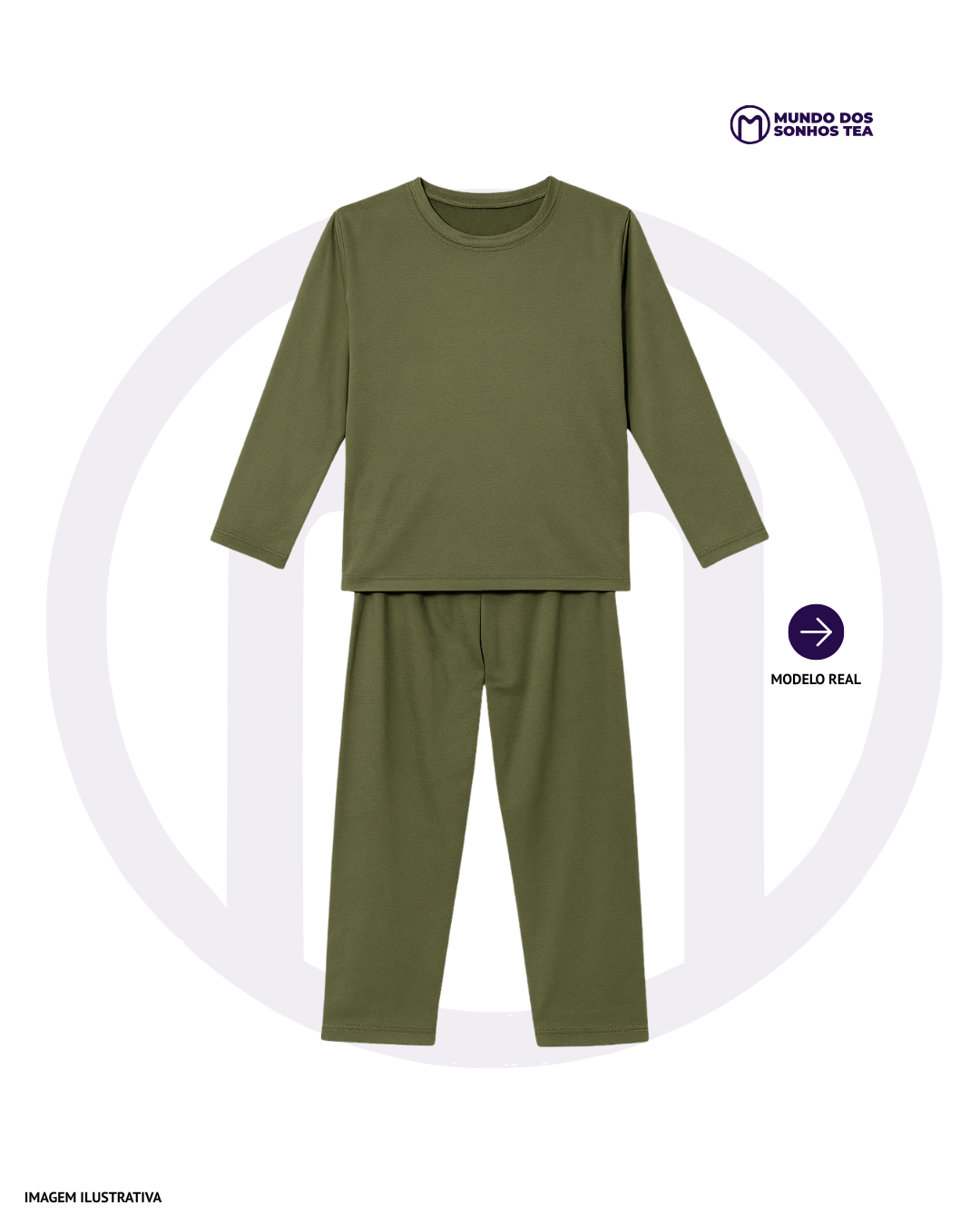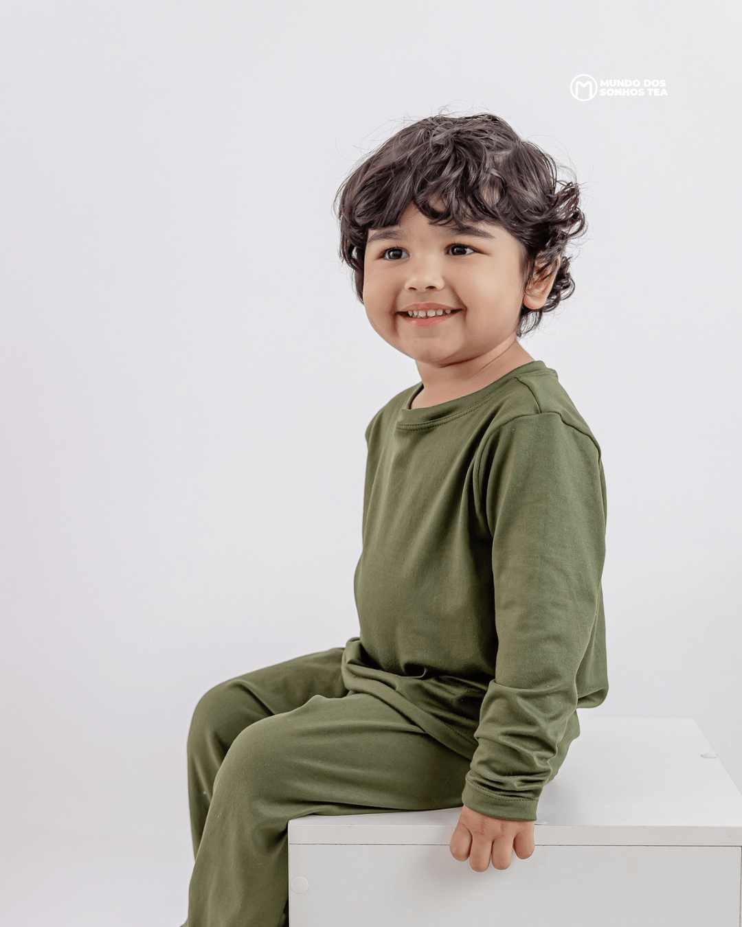 Conjunto sensorial longo com blusa manga longa e calça em modal premium. Cor verde militar, pensado para o conforto das crianças autistas. 🌿