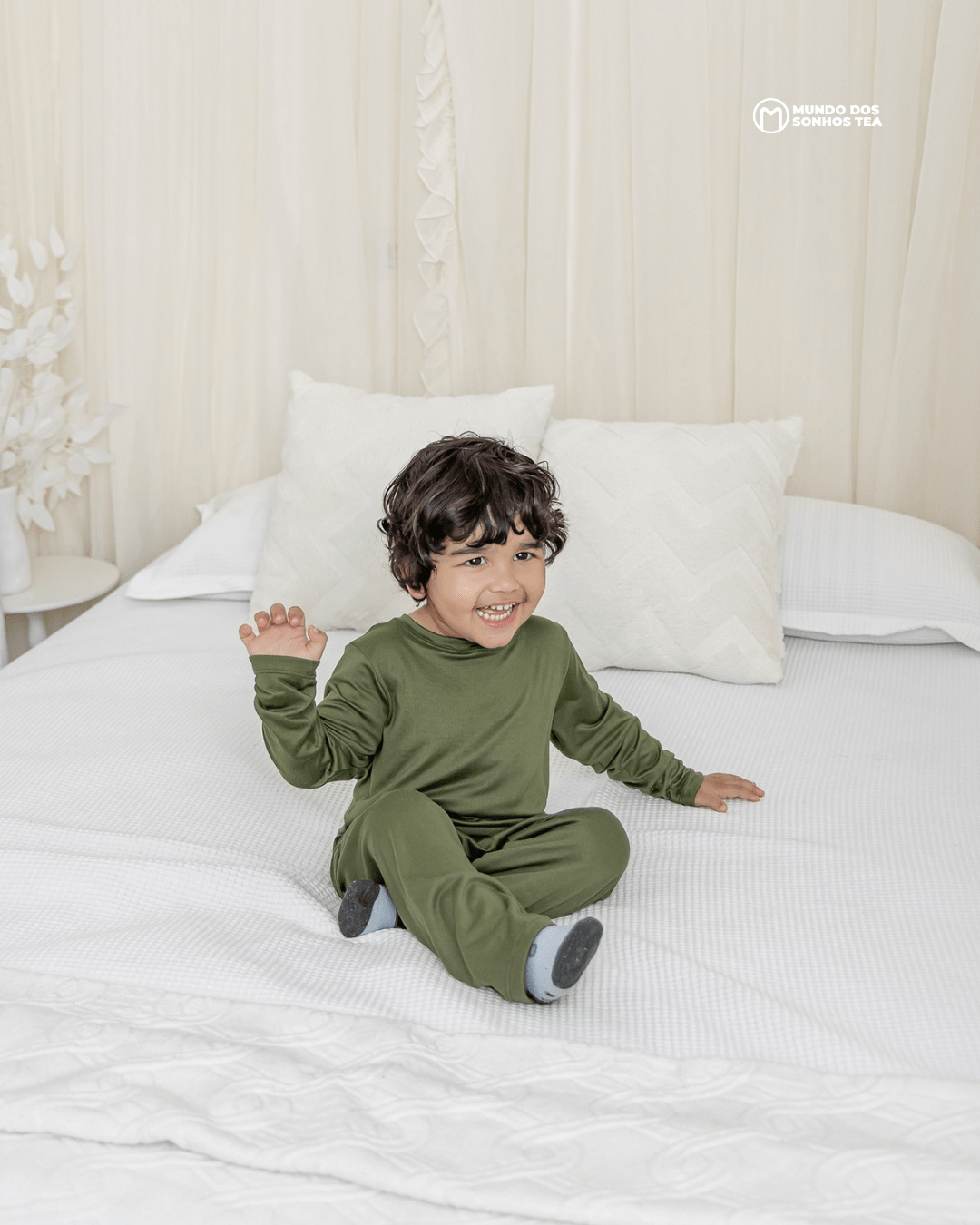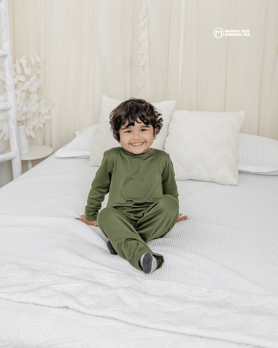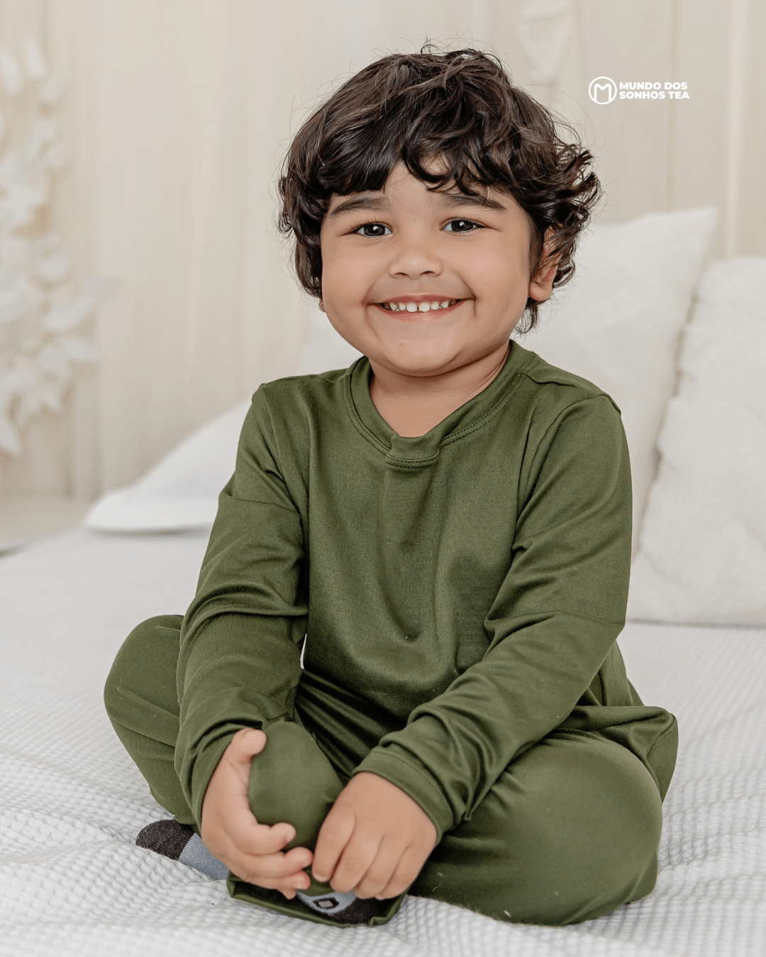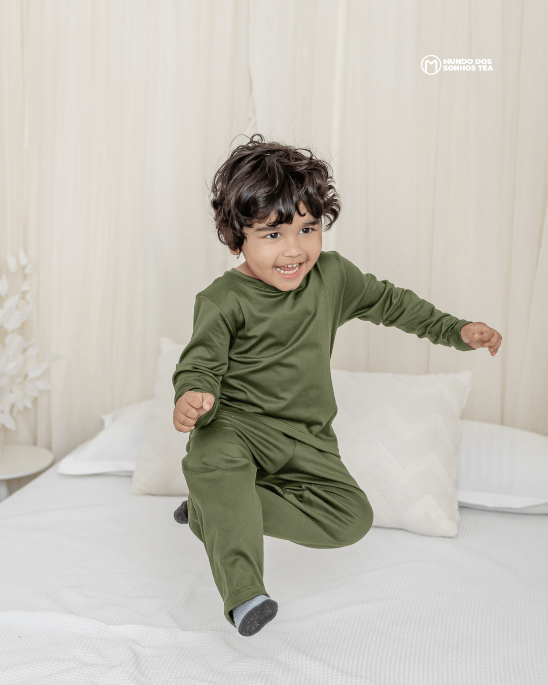 Conjunto sensorial longo com blusa manga longa e calça em modal premium. Cor verde militar, pensado para o conforto das crianças autistas. 🌿